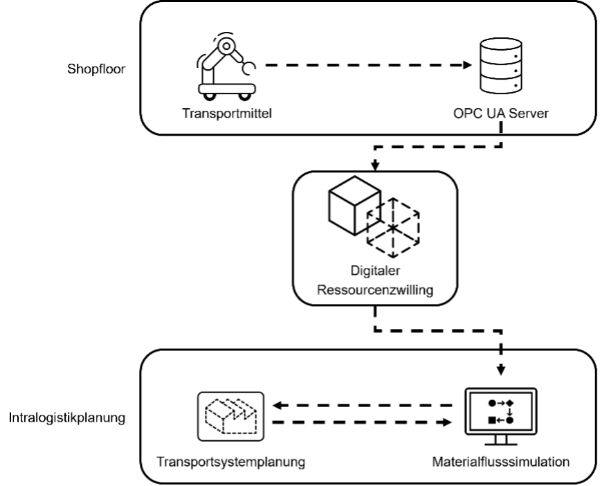 Sensordaten des Transportmittels werden erfasst und über einen OPC UA-Server in einem digitalen Ressourcenzwilling bereitgestellt. Dieser berechnet aus den Messwerten zuvor definierte Parameter für ein Simulationsmodell und speichert diese in einer Verwaltungsschale. Eine Methode innerhalb des Simulationsmodells nutzt dynamisch ausgelöste HTTP-Anfragen, die sich nach dem Betriebszustand der Ressource richten. Für jeden erfassten Zustand wird eine POST-Anfrage mit den entsprechenden Parametern im JSON-Format an einen vorgegebenen Endpunkt der Verwaltungsschale gesendet. Diese gibt daraufhin zustandsspezifische Kennwerte zurück, die anschließend im Simulationsmodell verarbeitet werden. Dieser zustandsabhängige, HTTP-basierte Datenaustausch ermöglicht es der Simulation, kontinuierlich mit genauen, aktuellen Werten zu arbeiten. Somit entsprechen die Parameter des Transportmittels exakt dem Verhalten des Transportmittels im realen Betrieb. Die Daten unterstützen sowohl die Optimierung bestehender Logistikprozesse als auch Neuplanungen mit demselben Transportmittel, etwa zur Auswahl der energieeffizientesten Route oder der Flottengröße mit optimaler Auslastung.