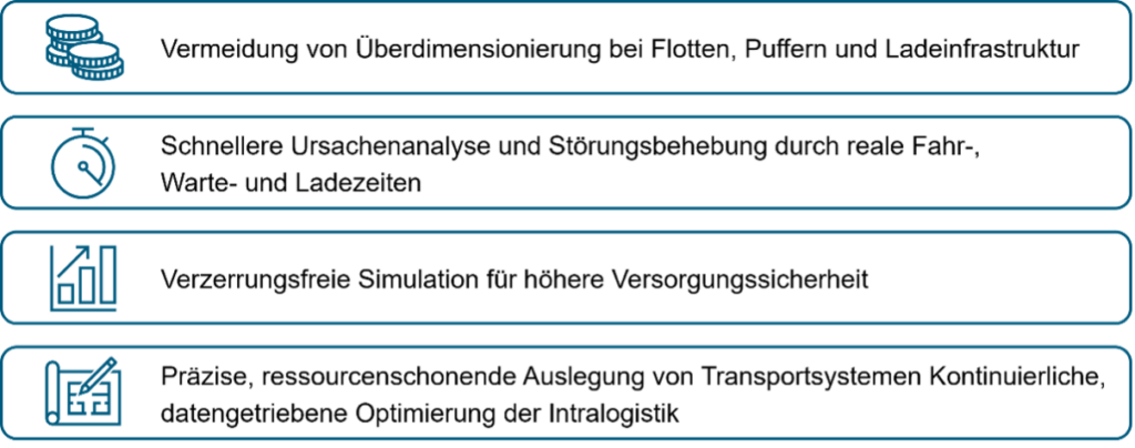 In mehreren Laborversuchen wurde gezeigt, dass das entwickelte Konzept sowohl bestehende Intralogistikprozesse verbessert als auch die Auslegung neuer Transportsysteme präziser macht. Untersucht wurde unter anderem, wie stark der simulierte Energieverbrauch abweicht, wenn Messwerte statt Herstellerangaben genutzt werden. Ebenso zeigte sich, dass die modellierte Durchlaufzeit bei Verwendung der gemessenen Fahrgeschwindigkeit deutlich von Simulationen mit Herstellergeschwindigkeiten differiert. Die direkte Nutzung von Betriebsdaten erhöht damit die Prognosegüte, vermeidet Sicherheitsaufschläge und Überdimensionierungen (z. B. bei Flottengrößen) und trägt gleichzeitig zur Sicherung der Linienversorgung bei.